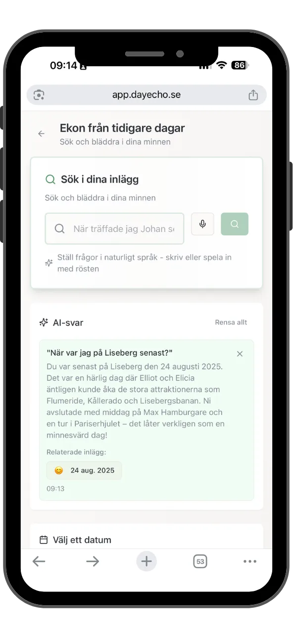 Nej, dayecho fungerar bäst som en daglig vana, men du kan lägga till poster när du vill. Även korta anteckningar eller snabba röstmeddelanden hjälper dig att bygga en sökbar tidslinje över ditt liv.